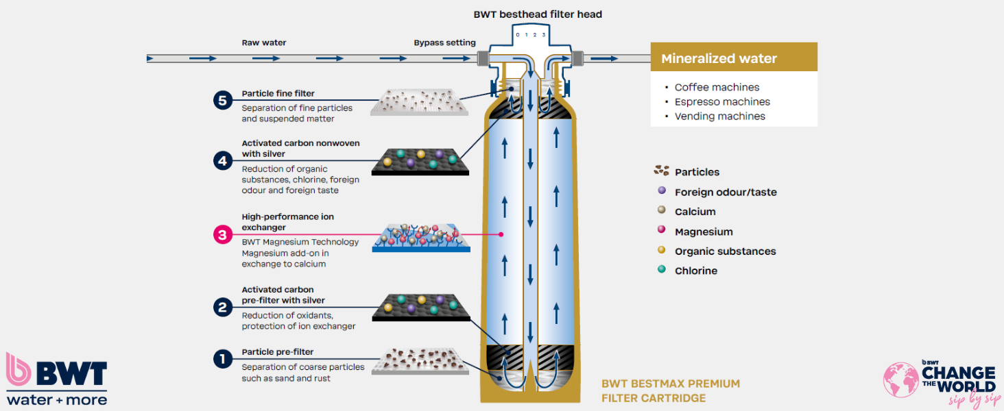 Desde el punto de vista del sabor, también es importante que el agua contenga minerales para que el café conserve su sabor y complejidad. Por ello, todas las soluciones de filtración de agua BWT que suavizan el agua conservarán minerales para evitar que el sabor se vea afectado.
