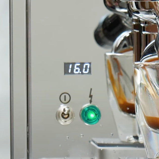 La compacta pantalla LED funciona como temporizador de café durante el proceso de preparación. También muestra alertas y la temperatura seleccionada al usar el interruptor PID para cambiar de configuración.
