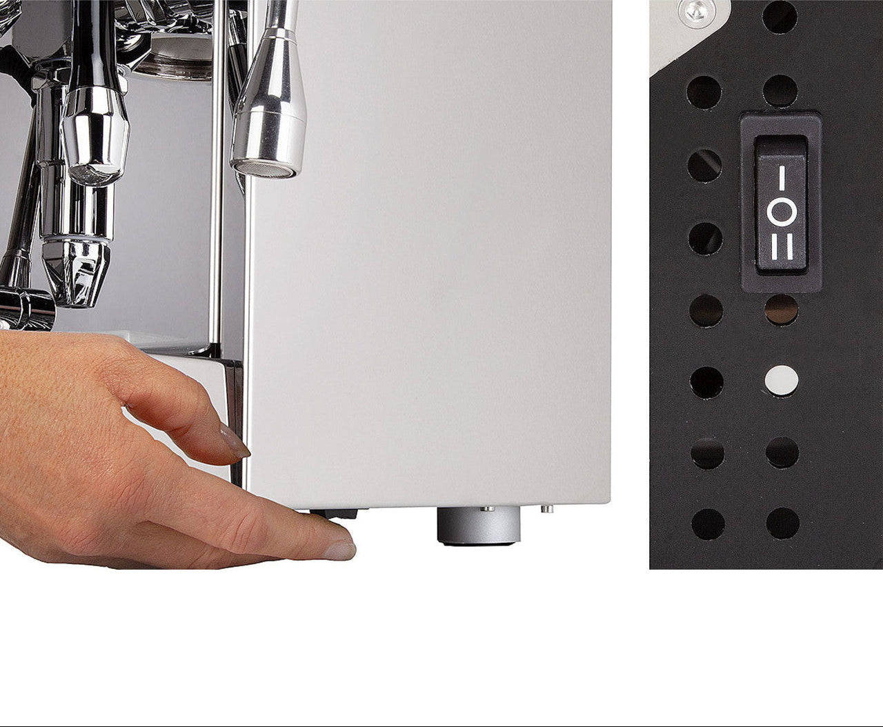 Ubicado en el lado derecho de la parte inferior de la máquina, el nuevo interruptor de tres posiciones permite un fácil ajuste entre tres temperaturas de caldera preestablecidas, así como la capacidad de activar o desactivar el modo de preinfusión y ECO.